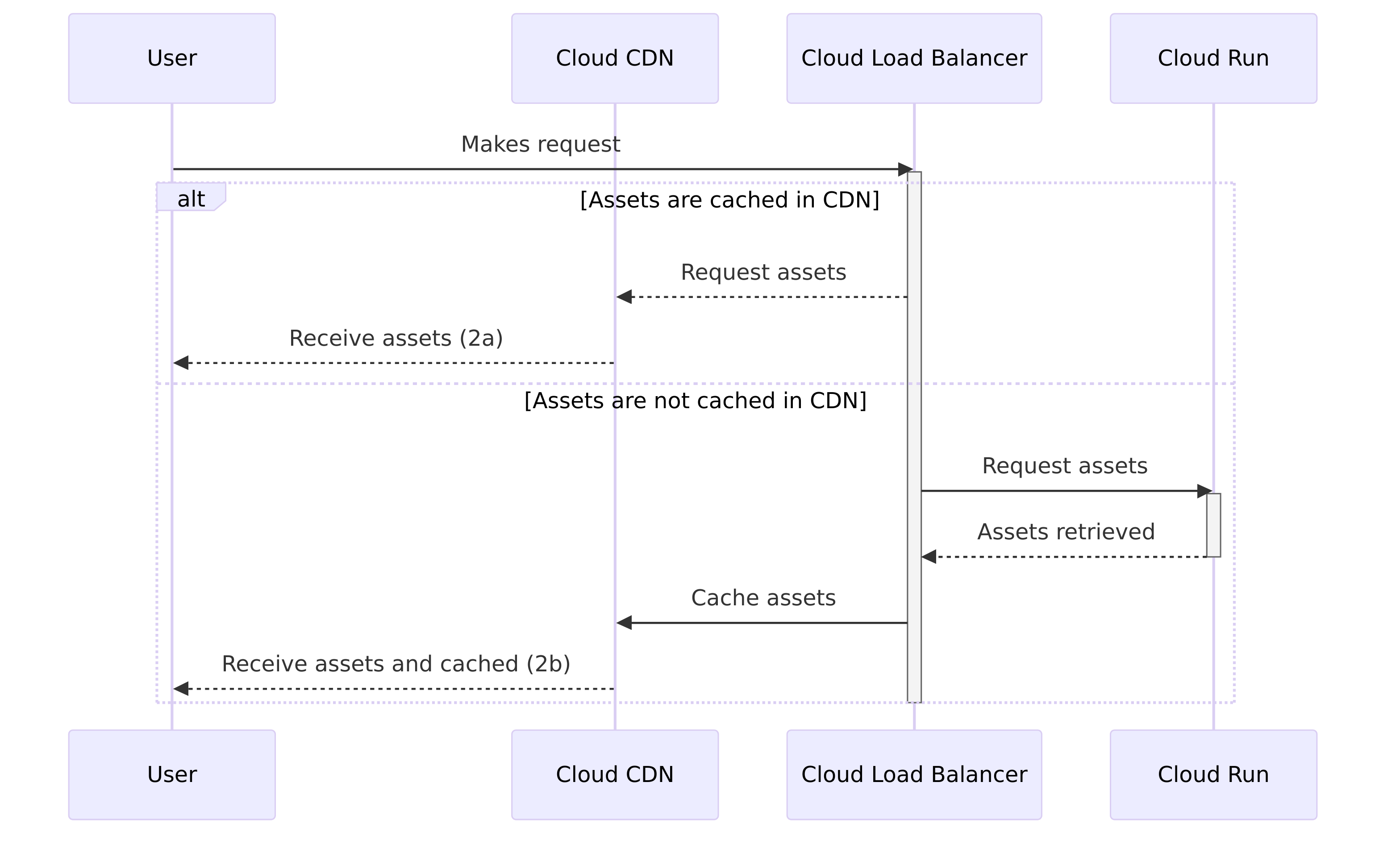 Cloud_CDN-->>User: Receive assets and cached (2b)